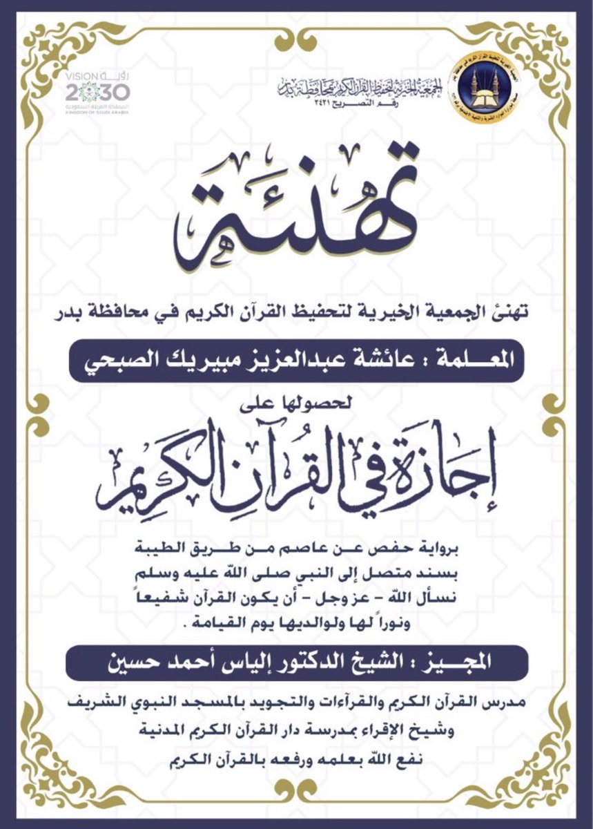 ديوانية حرب On Twitter حصلت المعلمة عائشة بنت عبدالعزيز مبيريك الصبحي على إجازة في حفظ القرآن الكريم برواية حفص عن عاصم اللهم اجعل القرآن العظيم نورا وشفيعا لها ولوالديها يوم