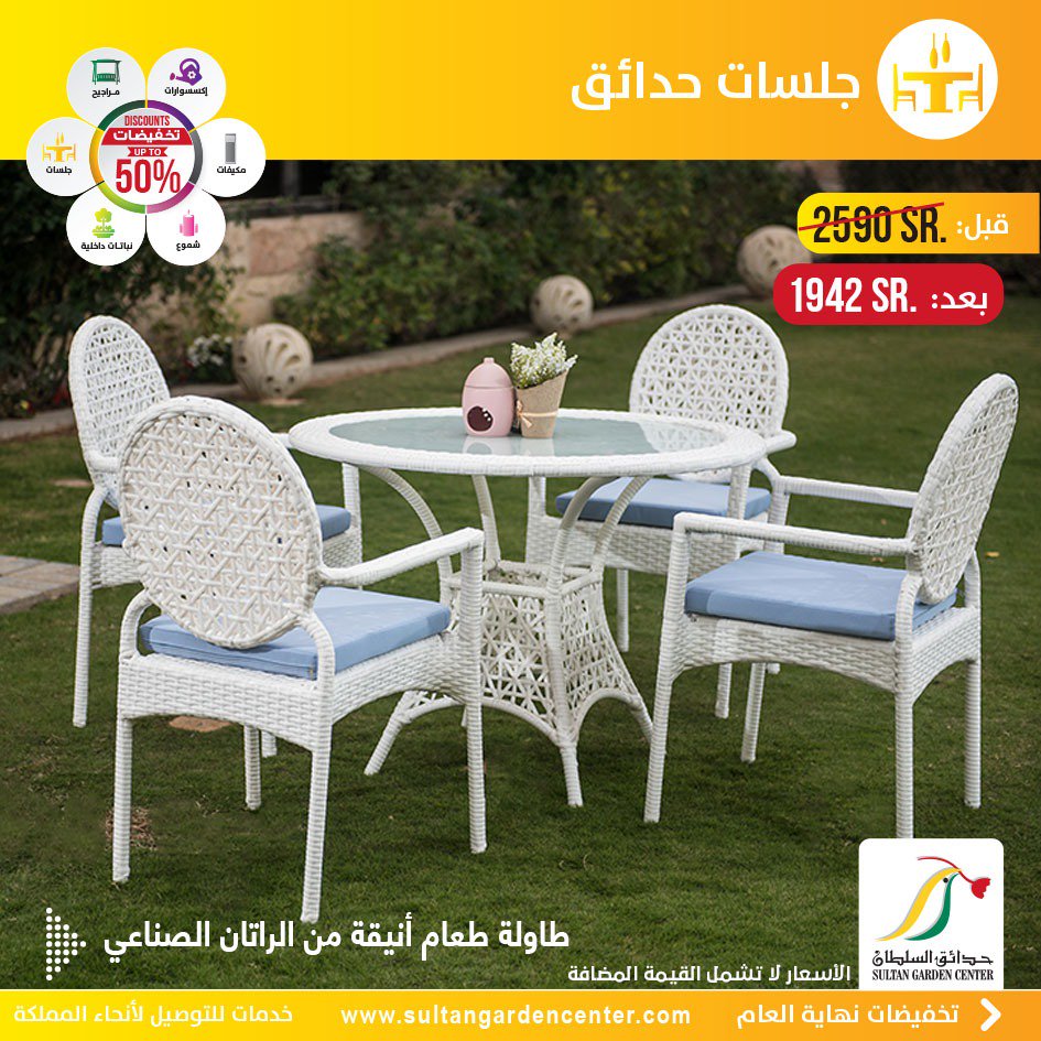 حدائق السلطان No Twitter تخفيضات حدائق السلطان اللون الأبيض الأنيق طاولة دائرية مع ٤ كراسي شكل وتصميم مميز من الراتان الصناعي مع وسائد زرقاء جميله ضمان
